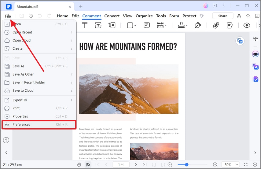 Installieren Sie PDFelement, rufen Sie die Oberfläche auf und klicken Sie auf die Schaltfläche „PDF öffnen“ auf der linken Seite, um eine PDF-Datei einzufügen. Navigieren Sie dann nach oben rechts, klicken Sie auf die Registerkarte „Datei“, um ein Dropdown-Menü aufzurufen, und wählen Sie „Einstellungen“.