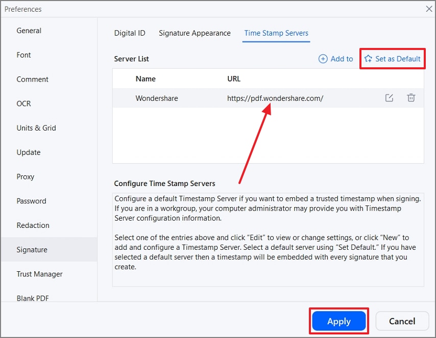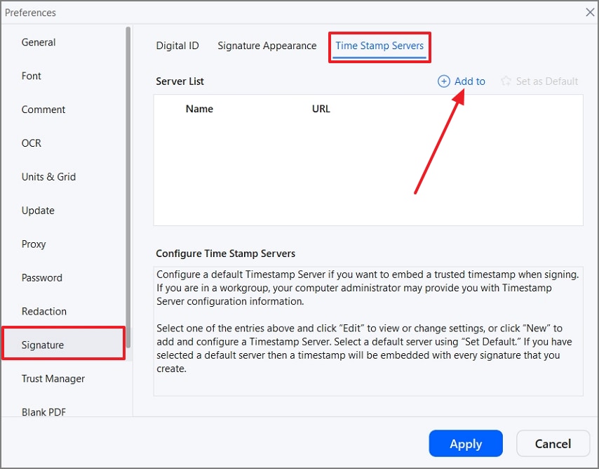 Öffnen Sie in dem neu geöffneten Dialogfeld die Registerkarte „Signatur“ und klicken Sie in der Ansicht „Zeitstempelserver“ auf „+ Hinzufügen zu“.
