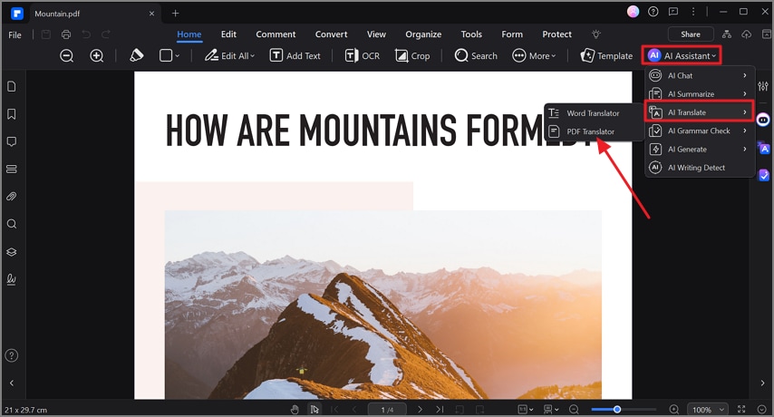Rufen Sie die Option „KI-Assistent“ in der oberen Symbolleiste auf und erweitern Sie das Menü für „KI-Übersetzen“. Klicken Sie anschließend auf die Option „PDF Übersetzer“ aus dem schwebenden Menü.