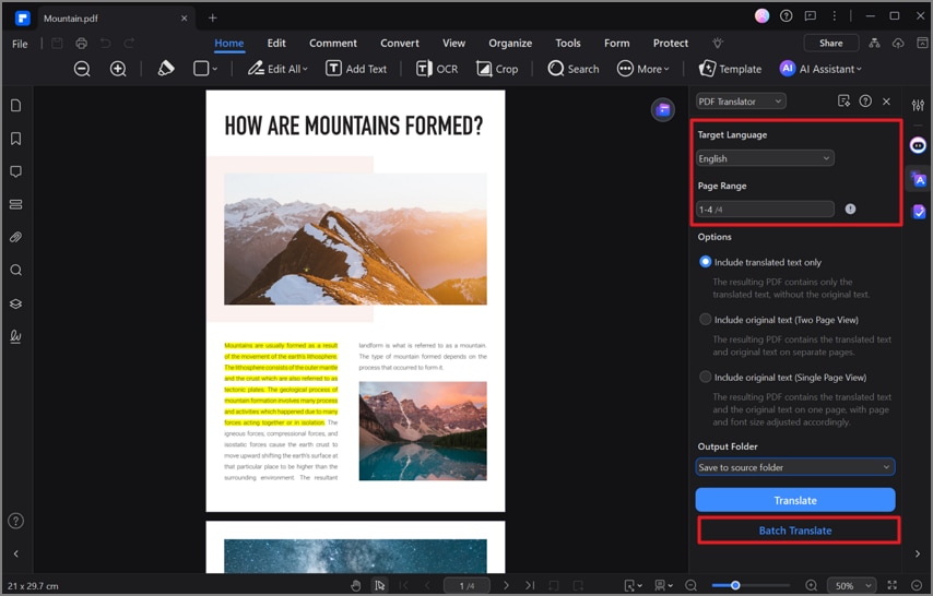 Mit den KI-Funktionen von PDFelement können Sie entweder jedes einzelne Wort oder das gesamte PDF-Dokument übersetzen. Außerdem können Sie eine bestimmte Sprache auswählen, indem Sie die Liste der Zielsprachen erweitern. Das Tool unterstützt Sie bei der Festlegung des Seitenbereichs für die Übersetzung Ihres Dokuments. Tauchen Sie also in die schrittweise Anleitung ein und übersetzen Sie mehrere Dokumente auf einmal: