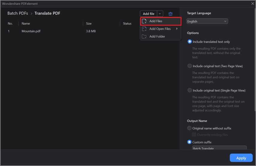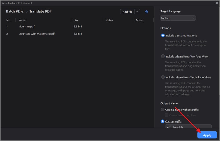 Klicken Sie schließlich auf die „Übernehmen“ Schaltfläche, um alle importierten Dateien auf einmal mit dem Tool zu übersetzen.