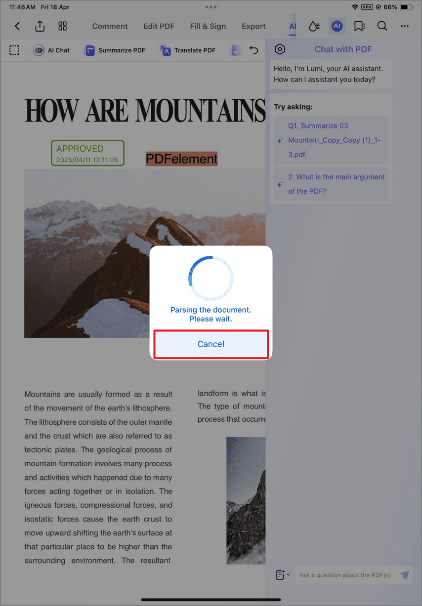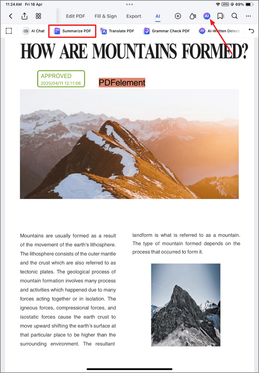 PDFelement für iOS liefert eine intelligente Zusammenfassung von Dokumenten, die in Sekundenschnelle wichtige Erkenntnisse aus langen PDFs extrahiert. Diese KI-gestützte Funktion fungiert als Ihr persönlicher Recherche-Assistent, der komplexe Berichte, akademische Dokumente und Geschäftsunterlagen in prägnante Übersichten destilliert und dabei wichtige Informationen und den Kontext beibehält.