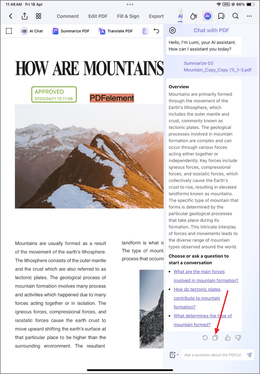 Recherche-Tipp: Generieren Sie bei akademischen Dokumenten zunächst eine Standardzusammenfassung, um die wichtigsten Konzepte zu erfassen, und fordern Sie dann eine detaillierte Aufschlüsselung der Methoden und Ergebnisse nach Abschnitten an. Die KI von PDFelement merkt sich den Dokumentenkontext und ermöglicht so Folgefragen zu bestimmten Ergebnissen.